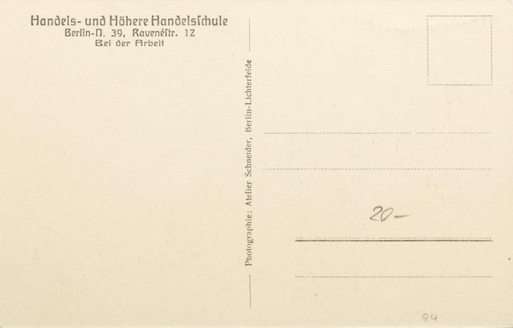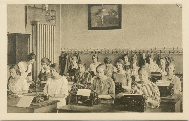 Illustrierte Postkarte; Fotografie, monochrom; Foto: Atelier Schneider, Berlin-Lichterfelde Rückseite: Unterrichtsraum mit Schülerinnen beim Maschinenschreiben Vorderseite mit Beschreibungstext: Handels- und Höhere Handelsschule, Berlin [...] Bei der Arbeit; nicht beschrieben