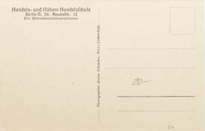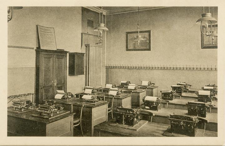 Illustrierte Postkarte; Fotografie, monochrom; Foto: Atelier Schneider, Berlin-Lichterfelde Rückseite: Unterrichtsraum mit Schreibmaschinen Vorderseite mit Beschreibungstext: Handels- und Höhere Handelsschule, Berlin [...] Ein Schreibmaschinenzimmer; nicht beschrieben
