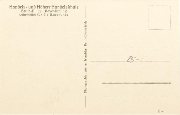 Illustrierte Postkarte; Fotografie, monochrom; Foto: Atelier Schneider, Berlin-Lichterfelde Rückseite: Unterrichtsraum mit Büchern und Schreibmaschinen Vorderseite mit Beschreibungstext: Handels- und Höhere Handelsschule, Berlin [...] Lehrmittel für die Bürokunde; nicht beschrieben