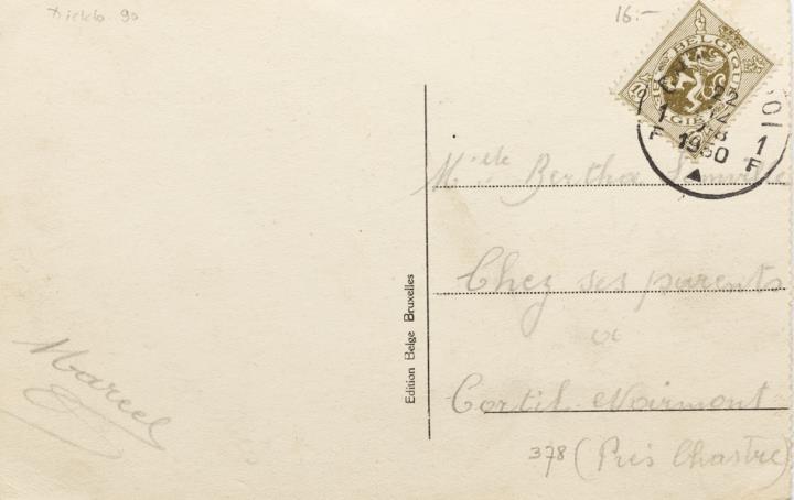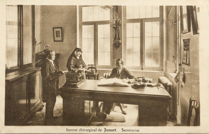 Illustrierte Postkarte; Fotografie, monochrom Rückseite: zwei männliche Mitarbeiter und eine Klosterfrau in einem Sekretariatszimmer mit Schreibmaschine, Kopierpresse und Telefon Vorderseite: adressiert an M.lle Someville, Cortil Narmont; Briefmarke Postes Belgique 10c; Poststempel 22.12.1950