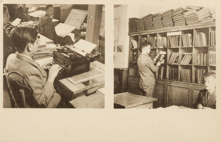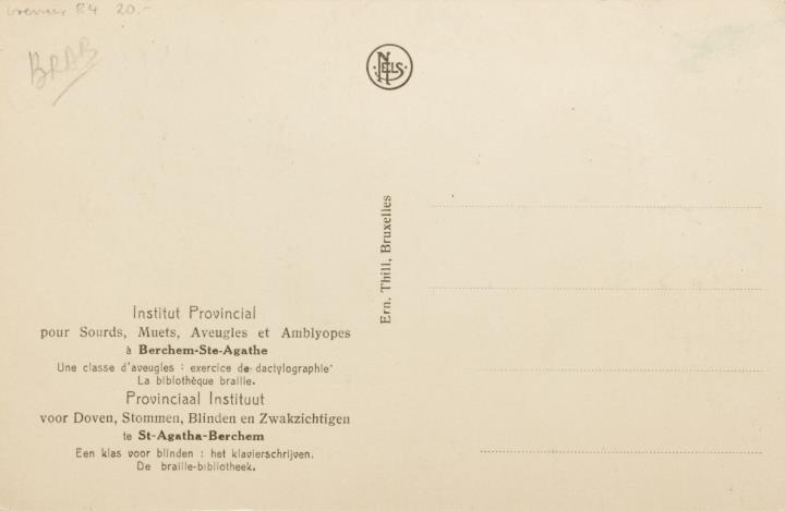 Illustrierte Postkarte; Fotocollage, monochrom Rückseite: zwei Ansichten einer Blindenschule; links: Unterrichtsraum, Junge/Schüler im Profil mit Schreibmaschine; rechts: Bibliothek, zwei Jungen/Schüler mit Büchern Vorderseite mit Beschreibungstext: Institut Provincial pour Sourds, Muets, Aveugles et Ambiyopes [...] exercice de dactylographie. La bibliothéque braille; nicht beschrieben