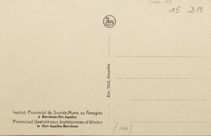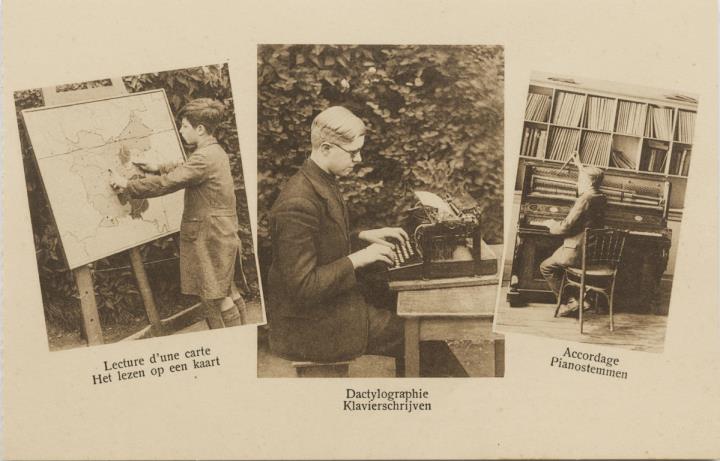 Illustrierte Postkarte; Fotocollage, monochrom Rückseite: drei Ansichten einer Blindenschule; Schüler beim Lesen einer Landkarte, Schüler mit Schreibmaschine, Schüler beim Klavierstimmen; zweisprachiger Text Vorderseite mit Beschreibungstext: Institut Provincial de Sourds-Muets ou Aveugles à Berchem-Ste-Agathe; nicht beschrieben