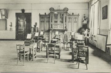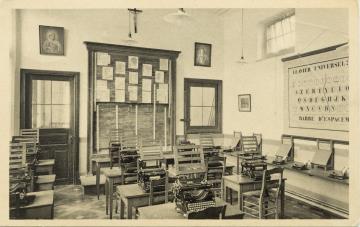 Illustrierte Postkarte; Fotografie, monochrom Rückseite: Unterrichtsraum mit Schreibmaschinen, Übungsheften und aufgehängten Tastaturschautafeln Vorderseite: beschrieben; adressiert an Monsieur Cambier, Bruxelles; Briefmarke Postes Belgique 35c; Poststempel Brussel 11.X 1938