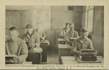 Illustrierte Postkarte; Fotografie, monochrom Rückseite: Unterrichtsraum; Männer/genesene Patienten des General Hospital No. 41 Fox Hills, Staten Island, N.Y. beim Schreibmaschinen-/Stenografieunterricht Vorderseite nicht beschrieben