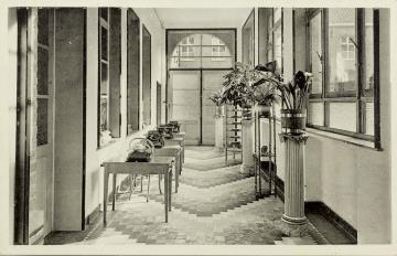 Illustrierte Postkarte; Fotografie, monochrom Rückseite: flurähnlicher Unterrichtsraum mit Schreibmaschinen, Grünpflanzen als Dekoration Vorderseite mit Beschreibungstext: Deftingen Pensionnat. Salle de dactylo; beschrieben, adressiert an M.elle Kieden, Gent; Briefmarke Postes Belgique 75c; Poststempel Deftingen