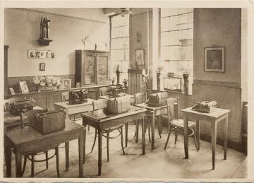 Illustrierte Postkarte; Fotografie, monochrom Rückseite: Unterrichtsraum mit Schreibmaschinen Vorderseite mit Beschreibungstext: Instituut van de Zusters Franciskanessen te Herentals. Schrijfmachienen; nicht beschrieben