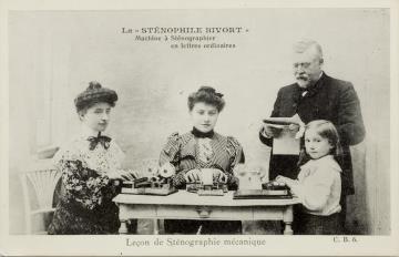 Werbepostkarte; Fotografie, monochrom; Nr. C.B.6 Rückseite: zwei Frauen und ein Mädchen mit Stenografiermaschine, Mann mit Diktiervorlage; weiterer Text: Leçon de Sténographie mécanique Vorderseite nicht beschrieben