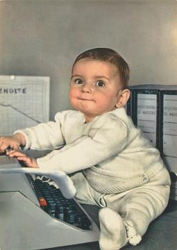 Illustrierte Postkarte; Fotografie, polychrom Rückseite: Baby mit Schreibmaschine Vorderseite nicht beschrieben