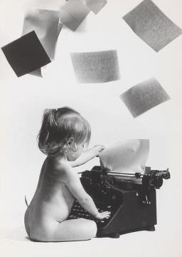 Illustrierte Postkarte; Fotografie, monochrom copyright 1987 Chris Nash Rückseite: Baby mit Schreibmaschine Vorderseite nicht beschrieben