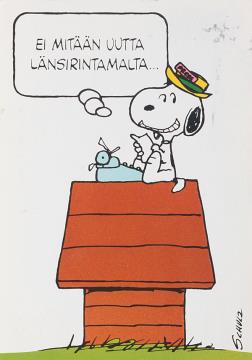 Illustrierte Postkarte; Grafik, polychrom; Grafik: Charles M. Schulz Rückseite: Hund Snoopy mit Schreibmaschine Vorderseite: beschrieben, adressiert; Briefmarke Finland 2,70; Poststempel Mikkeli/14.-3.1990