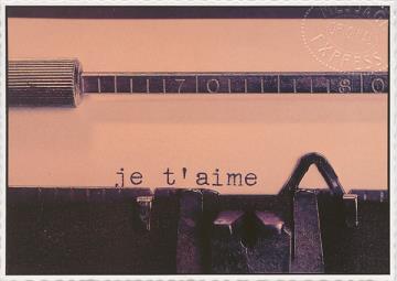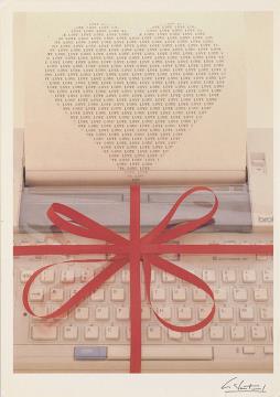 Illustrierte Postkarte; Fotografie, polychrom Cartes d'Art Nr. BL2, Bertrand le Pautremat "Page d'ecriture" Rückseite: Schreibmaschine mit roter Masche, Briefblatt mit Herz (geformt aus dem wiederholt getippten Wort "Love") Vorderseite nicht beschrieben