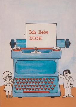 Illustrierte Postkarte; Grafik, polychrom Rückseite: kleiner Mann/kleine Frau neben Schreibmaschine mit Tasten in Herzform Vorderseite nicht beschrieben