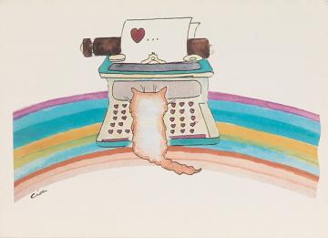 Illustrierte Postkarte; Grafik, polychrom Rückseite: Katze sitzt vor einer Schreibmaschine mit Tasten in Herzform Vorderseite: beschrieben, adressiert; Briefmarke Postes Francaises 2.30 F; Poststempel Bureau Postal Militaire/6-5 1991