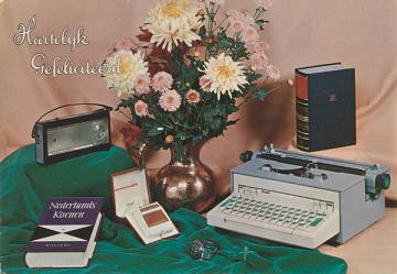 Illustrierte Postkarte; Fotografie, polychrom Rückseite: Schreibmaschine Olivetti neben Blumenstrauß, Transistorradio, Rasierapparat, Armbbanduhr und Büchern Vorderseite: beschrieben, adressiert; Briefmarke Nederland 20c; Poststempel Musselkanaal/25.IX.1972