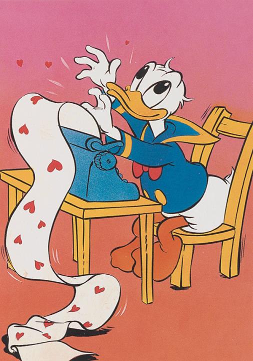 Illustrierte Postkarte; Grafik, polychrom; Walt Disney Nr. 535801 Rückseite: Ente Donald Duck mit Schreibmaschine, Papier mit kleinen Herzen Vorderseite nicht beschrieben