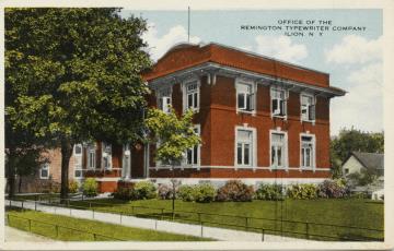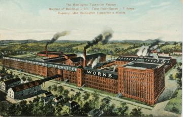 Illustrierte Postkarte; Fotografie, koloriert; Nr. c14599 Rückseite: Luftaufnahme; Gebäudeansicht der Remington Schreibmaschinenwerke; weiterer Text: Number of Buildings - 20. Total Floor Space - 7 Acres. Capacity: One Remington Typewriter a Minute Vorderseite nicht beschrieben