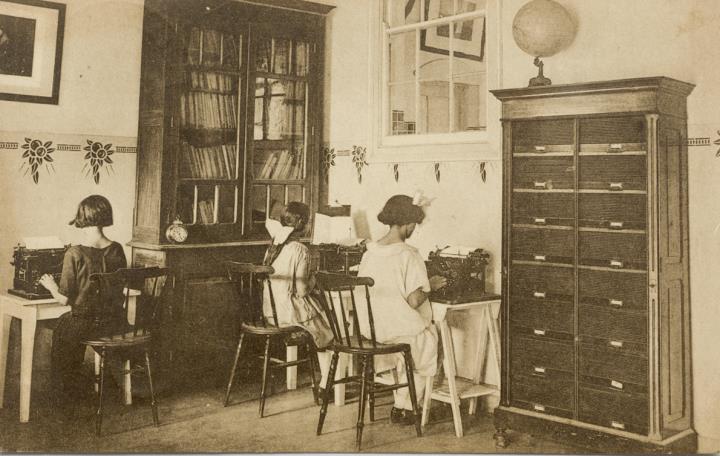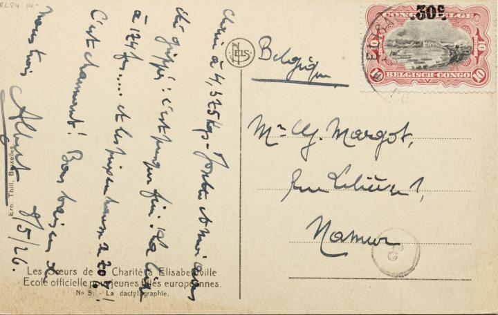 Illustrierte Postkarte; Fotografie, monochrom Rückseite: drei Mädchen (Rückenansicht) mit Schreibmaschine Vorderseite mit Beschreibungstext: Les Soeurs de la Charité a Elisabethville [...] La dactylographie; beschrieben, adressiert an M.m Margot, Namur; Briefmarke Belgisch-Congo 10 centimes; Poststempel unleserlich