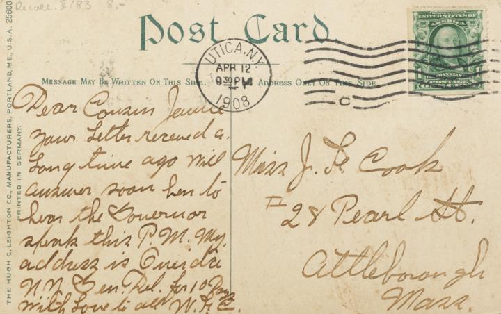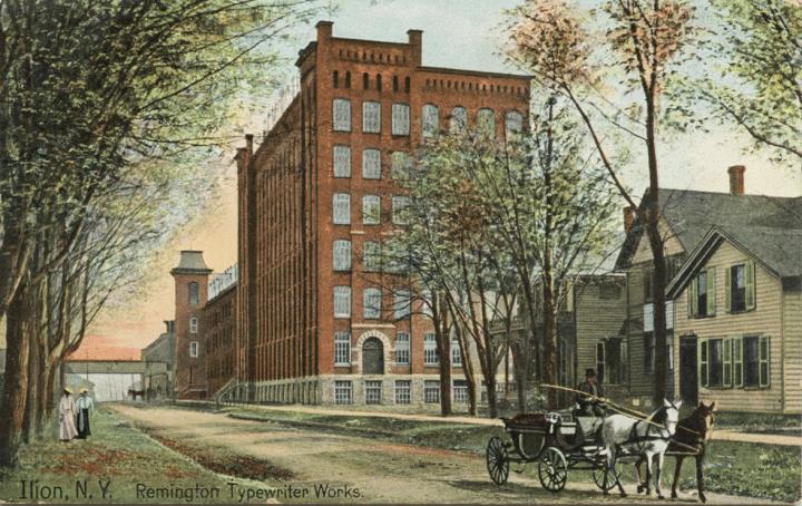 Illustrierte Postkarte; Fotografie, koloriert; Nr. 25600 Rückseite: Ansicht der Remington Schreibmaschinenwerke, im Vordergrund Baumallee mit Spaziergängern, Wohngebäuden und Pferdekutsche Vorderseite: beschrieben; adressiert an Miss Cook, Attleborough; Briefmarke U.S. Postage One Cent; Poststempel Utica NY/Apr 12 1908