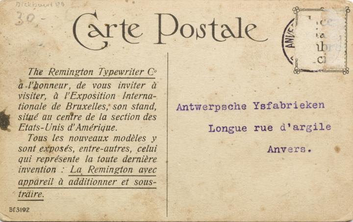 Werbepostkarte; Fotografie, monochrom; Nr. Bf3192 Rückseite: Aufnahme der Belegschaft der Remington Schreibmaschinenwerke vor dem Fabriksgebäude Vorderseite: vorgedruckter Text (Einlandung zum Besuch des Messestandes); maschinenschriftlich adressiert an Antwerpsche Ysfabrieken, Anvers