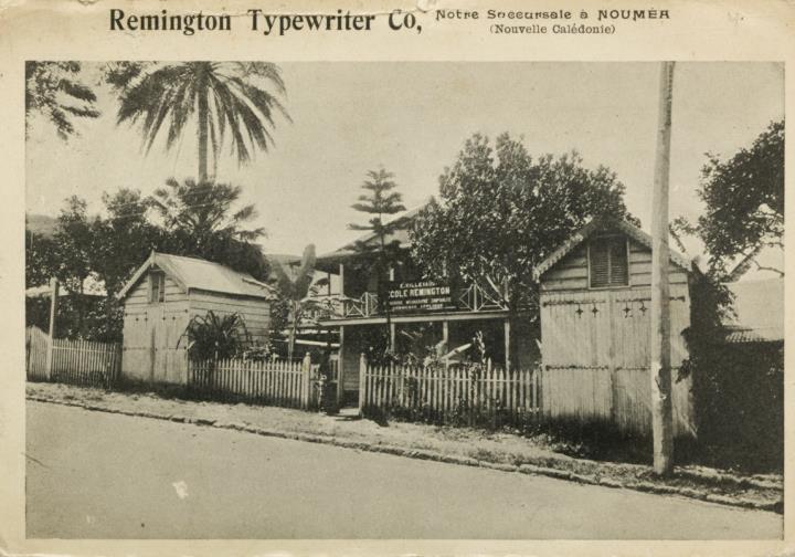 Illustrierte Postkarte; Fotografie, monochrom Rückseite: Gebäudeansicht einer Filiale der Remington Schreibmaschinenwerke; weiterer Text: Notre Succursale à Nouméa (Nouvelle Calédonie) Vorderseite: nicht beschrieben; vorgedruckte Anschrift