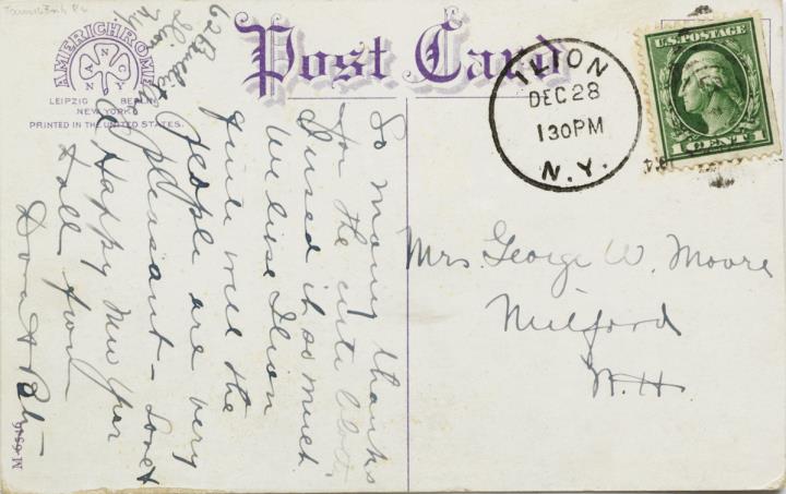 Illustrierte Postkarte; Fotomontage, polychrom; Nr. M-6546, Photo copyright 1911, Geo W. Thompson Rückseite: Schreibmaschine Remington im Großformat vor dem Fabriksgebäude, umgeben von der Belegschaft Vorderseite: beschrieben; adressiert an Mrs. Moore, Milford; Briefmarke U.S. Postage 1 Cent; Poststempel Ilion NY/Dec 28