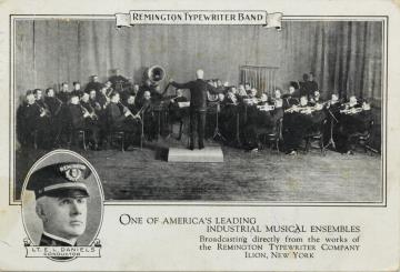 Illustrierte Postkarte; Fotocollage, monochrom; Nr. B 6575 Rückseite: Ansicht der Musikkapelle der Remington Schreibmaschinenwerke, in einem Medaillon Porträt des Kapellmeisters; weiterer Text: One of America's leading industrial musical ensembles [...] Vorderseite mit vorgedrucktem Dankestext, signiert; maschinenschriftlich adressiert an Miss Tanner, Gloucester; Poststempel Ilion/ Jul 21 1927