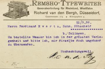 Illustrierte Postkarte; Grafik, monochrom Rückseite mit Firmendruck; maschinenschriftlicher Text, datiert 21/9.1898 Vorderseite: adressiert an Ferdinand Everts & Sohn, Höhscheid; Briefmarke Reichspost 5 Pf; Poststempel Düsseldorf/21.9.1898