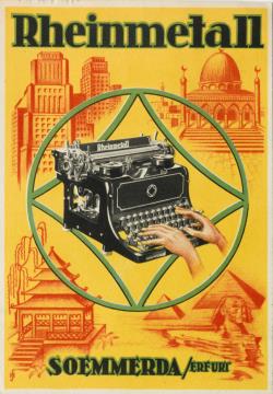 Werbepostkarte; Grafik, polychrom Rückseite: Schreibmaschine Rheinmetall, im Hintergrund Darstellung einer Stadt, Brücke, Eisenbahn, Flugzeug, Fluss, Schiff Vorderseite nicht beschrieben