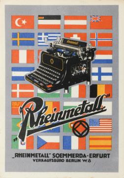 Werbepostkarte; Grafik, polychrom Rückseite: Schreibmaschine Rheinmetall und Flaggen verschiedener Nationen Vorderseite nicht beschrieben