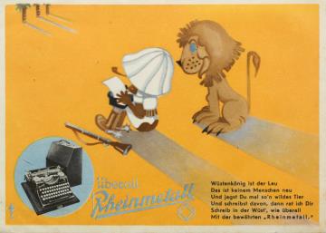 Werbepostkarte; Grafik, polychrom Rückseite: Wüstenszene mit Löwe und Mann in Topenkleidung mit Schreibmaschine; Werbetext in Versform; Rundbild mit Kofferschreibmaschine Rheinmetall Vorderseite: beschrieben, datiert 11-9-34; adressiert an Monsieur Verhaeren, Bruxelles; Briefmarke Deutsches Reich 5 RPf.; Poststempel Berlin 11 9 34