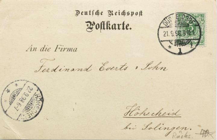 Illustrierte Postkarte; Grafik, monochrom Rückseite mit Firmendruck; maschinenschriftlicher Text, datiert 21/9.1898 Vorderseite: adressiert an Ferdinand Everts & Sohn, Höhscheid; Briefmarke Reichspost 5 Pf; Poststempel Düsseldorf/21.9.1898