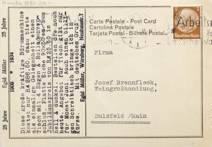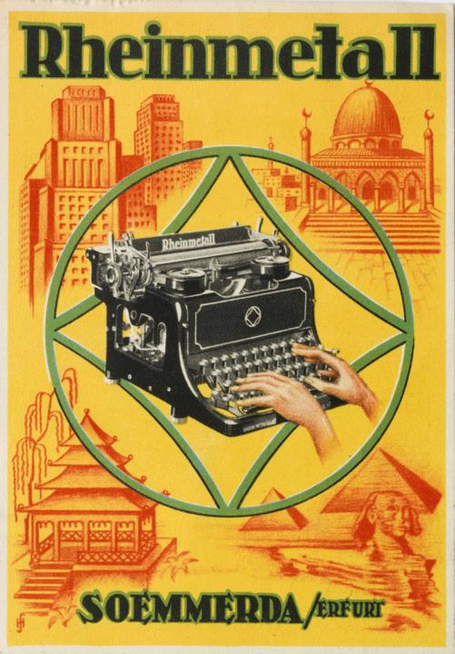 Werbepostkarte; Grafik, polychrom Rückseite: Firmenlogo und Schreibmaschine Rheinmetall, umgeben von Architektur verschiedener Erdteile Vorderseite: maschinenschriftlicher Text; adressiert an Firma Josef Brennfleck, Sulzfeld/Main; Briefmarke Deutsches Reich 3 RPf., Poststempel unleserlich