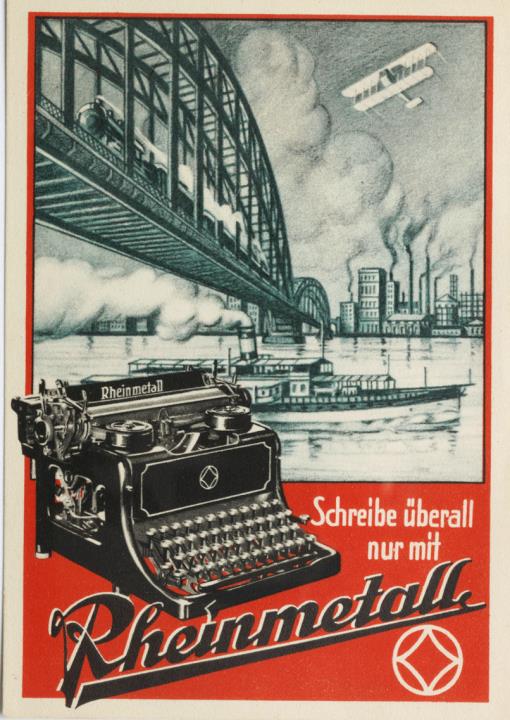 Werbepostkarte; Grafik, polychrom Rückseite: Schreibmaschine Rheinmetall, im Hintergrund Darstellung einer Stadt, Brücke, Eisenbahn, Flugzeug, Fluss, Schiff Vorderseite nicht beschrieben