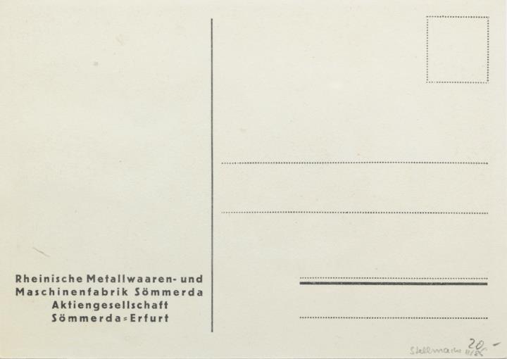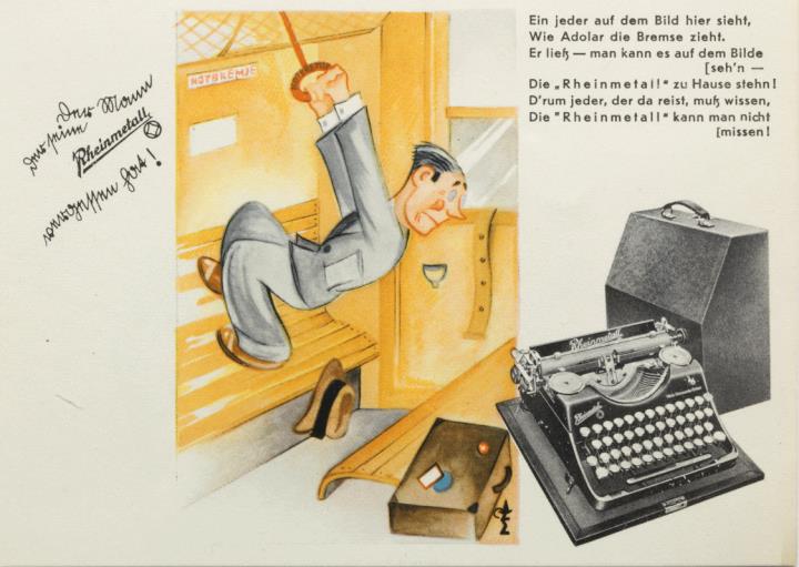 Werbepostkarte; Grafik, polychrom Rückseite: Mann in einem Zugabteil beim Ziehen der Handbremse; daneben Werbetext in Versform und Kofferschreibmaschine Rheinmetall Vorderseite nicht beschrieben