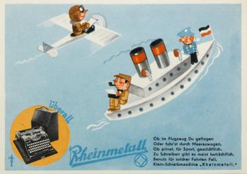 Werbepostkarte; Grafik, polychrom Rückseite: ein Dampfschiff auf offener See wird von einem Flugzeug überflogen, Pilot und Schiffspassagier mit Schreibmaschine; Werbetext in Versform; Rundbild mit Kofferschreibmaschine Rheinmetall Vorderseite nicht beschrieben
