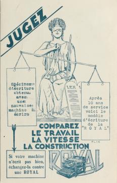 Werbepostkarte; Grafik, monochrom Rückseite: Justitia und Schreibmaschine Royal; Werbetexte in Kartuschen; weiterer Text: Comparez le travail la vitesse la construction Vorderseite: vorgedrucktes Filialenverzeichnis; nicht beschrieben