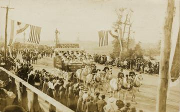 Illustrierte Postkarte; Fotografie, monochrom Rückseite: von Zuschauern gesäumte Parade mit Reitern und Musikkapellenwagen, Fahnen als Festdekoraktion Vorderseite nicht beschrieben