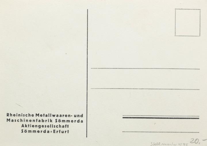 Werbepostkarte; Grafik, polychrom Rückseite: ein Dampfschiff auf offener See wird von einem Flugzeug überflogen, Pilot und Schiffspassagier mit Schreibmaschine; Werbetext in Versform; Rundbild mit Kofferschreibmaschine Rheinmetall Vorderseite nicht beschrieben
