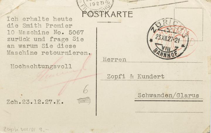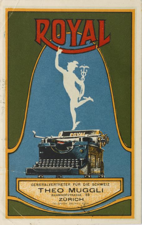 Werbepostkarte; Grafik, polychrom Rückseite: Schreibmaschine Royal, darüber Schattenriss einer Hermesfigur; Text: Generalvertreter für die Schweiz Theo Muggli, Zürich Vorderseite: mit Schreibmaschine beschrieben, datiert 23.12.27; adressiert an Herren Zopfi & Kundert, Schwanden/Glarus; Poststempel Zürich 23 XII 27