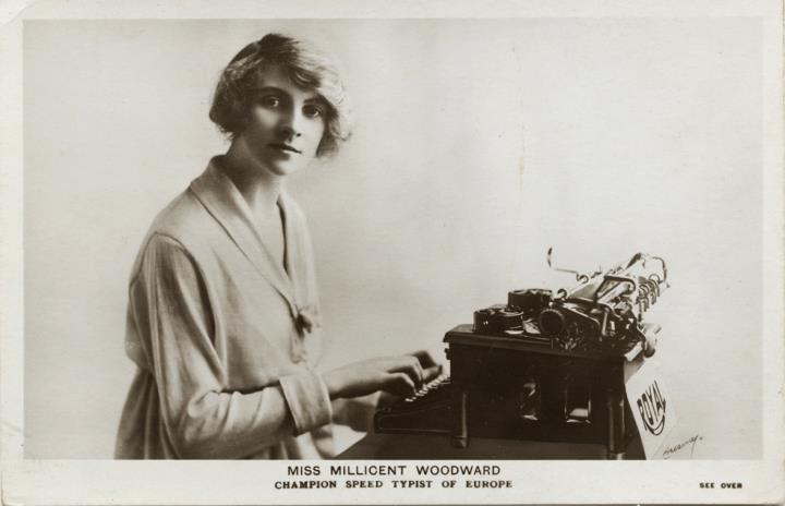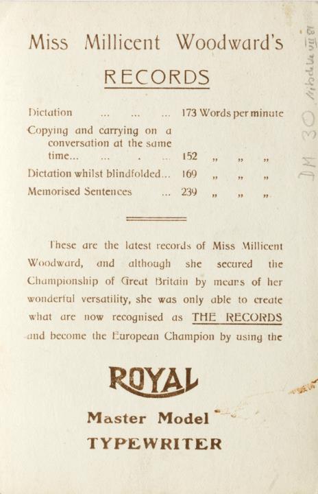 Werbepostkarte; Fotografie, monochrom Rückseite: Frau mit Schreibmaschine; weiterer Text: Champion Speed Typist of Europe Vorderseite mit vorgedrucktem Werbetext
