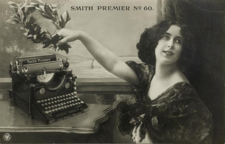 Werbepostkarte; Fotografie, monochrom Rückseite: Frau mit Lorbeerkranz und Schreibmaschine Smith Premier Vorderseite nicht beschrieben