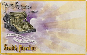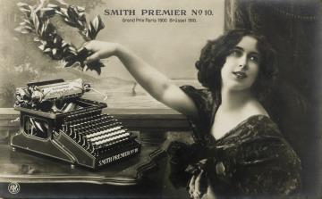Werbepostkarte; Fotografie, monochrom Rückseite: Frau mit Lorbeerkranz und Schreibmaschine Smith Premier; weiterer Text: Grand Prix Paris 1900 Brüssel 1910 Vorderseite nicht beschrieben
