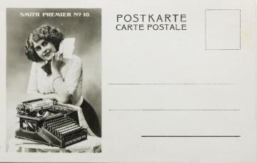 Werbepostkarte; Fotografie, koloriert; Rückseite: Mädchen mit Schreibmaschine Smith Premier Vorderseite nicht beschrieben