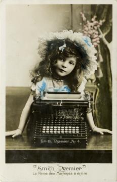 Werbepostkarte; Fotografie, koloriert; Rückseite: Mädchen mit Spitzenhut und Schreibmaschine Smith Premier Nr 4 Vorderseite: beschrieben