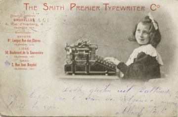 Werbepostkarte; Fotografie, monochrom Rückseite: Mädchen mit Schreibmaschine Smith Premier; gedrucktes Filialenverzeichnis, Leerraum beschrieben Vorderseite: adressiert an Madame Tierlé, Uccle; fünf Poststempel (u.a. Anvers/1 Octo 1905)
