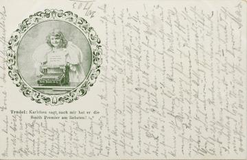 Werbepostkarte; Grafik, monochrom Rückseite: Rundbild mit Mädchen und Schreibmaschine Smith Premier; Text: Karlchen sagt nach mir hat er die Smith Premier am liebsten!; Leerraum beschrieben Vorderseite: adressiert an Fräulein Locknitz, Lübeck; Briefmarke Deutsches Reich 5 Pf., Poststempel Marburg 21.7.1903 / Lübeck 21.7.1903