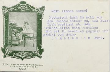 Werbepostkarte; Grafik, monochrom Rückseite: Kartuschenbild mit Mädchen und Schreibmaschine Smith Premier; Text: Mamma ich lerne die Smith Premier, dann brauche ich nicht in die Schule!; Leerraum mit Schreibmaschine beschrieben Vorderseite: adressiert an Fräulein Graf, Nehesdorf; zwei Briefmarken Deutsches Reich 3 Pf., Poststempel Berlin 28.2.1905 / Finsterwald 28.2.1905