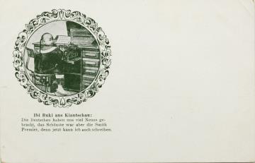 Werbepostkarte; Grafik, monochrom Rückseite: Rundbild mit Jungen und Schreibmaschine Smith Premier; Text: Die Deutschen haben uns viel Neues gebracht, das Schönste war aber die Smith Premier, denn jetzt kann ich auch schreiben; Leerraum Vorderseite nicht beschrieben