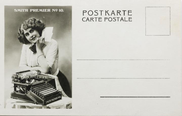 Postkarte mit Werbebild; Fotografie, monochrom Vorderseite: Frau mit Schreibmaschine Smith Premier Rückseite nicht beschrieben