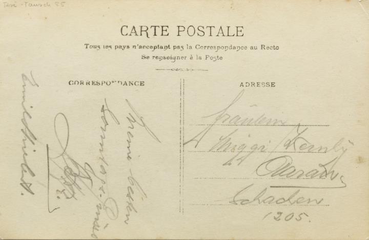 Werbepostkarte; Fotografie, koloriert; Rückseite: Mädchen mit Spitzenhut und Schreibmaschine Smith Premier Nr 4 Vorderseite: beschrieben